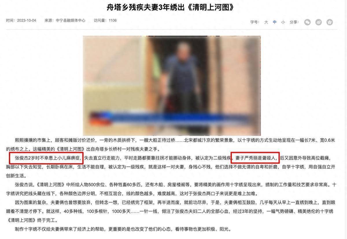 网友称张俊杰“残疾人妻子”名为丁秀丽,而据查证,此信息极有可能源自“张冠李戴”的AI生成文章,原型是宁夏舟塔乡的一对残疾人夫妻。丈夫张俊杰、妻子严秀丽,两人3年绣出一副《清明上河图》成为当地美谈,被媒体广泛报道。鉴于此,霸王茶姬方也已报案。新京报消息,2025年5月上海警方破获一起AI造谣传谣言损害企业权益案,抓获姚某、陈某等8名犯罪嫌疑人,皆为利用AI技术恶意针对霸王茶姬创始人创业经历及婚姻状况编撰抹黑文章,谋取流量。