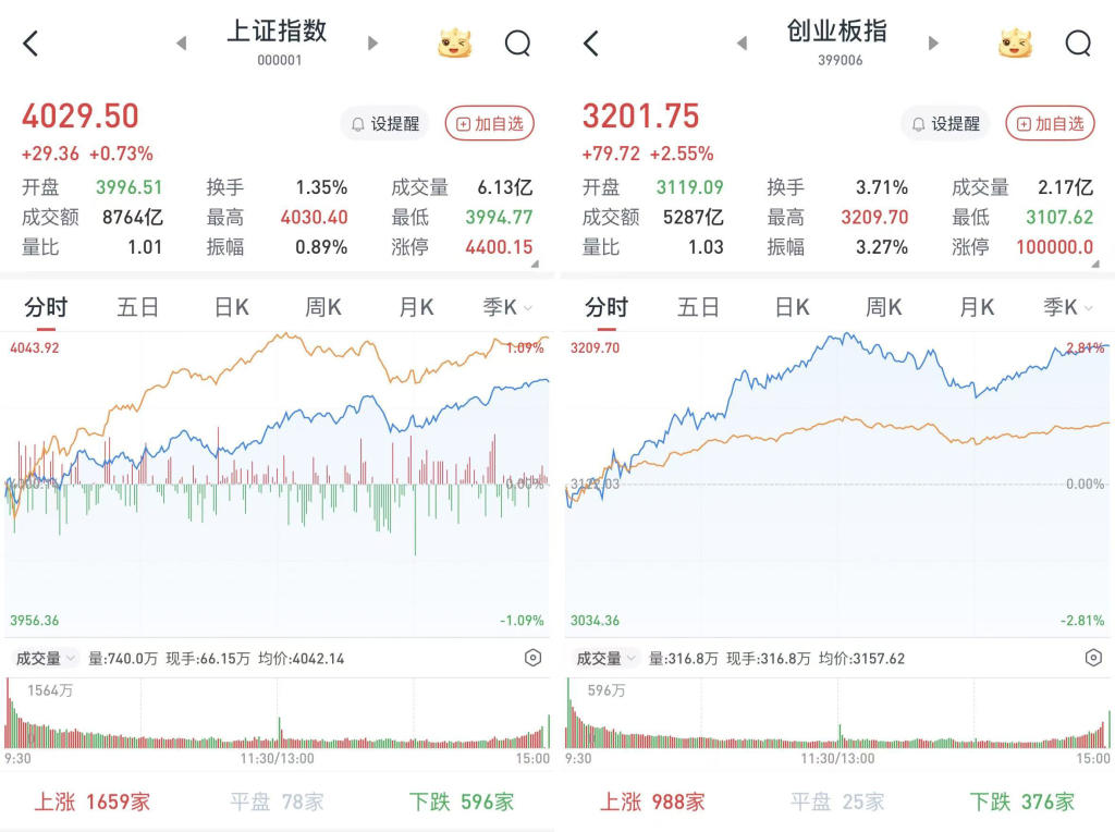 至收盘,上证综指涨0.73%,报4029.5点;科创50指数涨1.44%,报1399.29点;深证成指涨1.78%,报13476.52点;创业板指涨2.55%,报3201.75点。