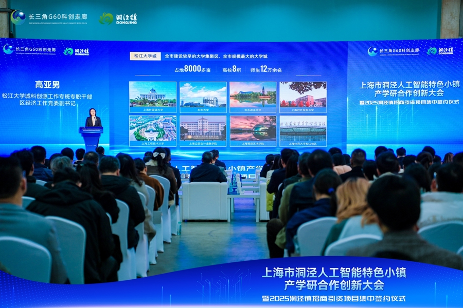 以松江大学城科创源为引领,推进产学研合作创新。日前,松江洞泾人工智能特色小镇产学研合作创新大会暨2025洞泾镇招商引资项目集中签约大会举行,依托松江大学城科创源高校优势学科,引导企业加强应用场景和关键核心技术供需衔接匹配。