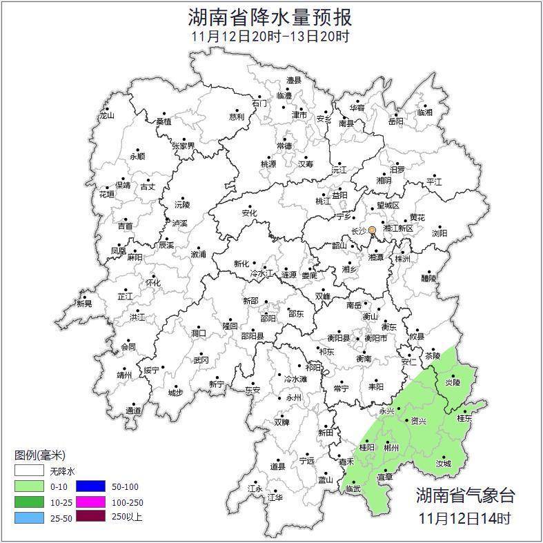 11月12日14时湖南省气温实况图湖南省气象台预计未来三天(11月13晚至15日)湖南大部晴为主气温逐步上升其中14日、15日清晨湘西、湘北部分地区有雾13至14日湘北局地有霾天气未来三天全省预报今天晚上至明天白天,湘东南小雨转多云,其他地区多云间晴天;北风2~3级;北风2~3级;最低气温8~11℃;最高气温19~22℃。