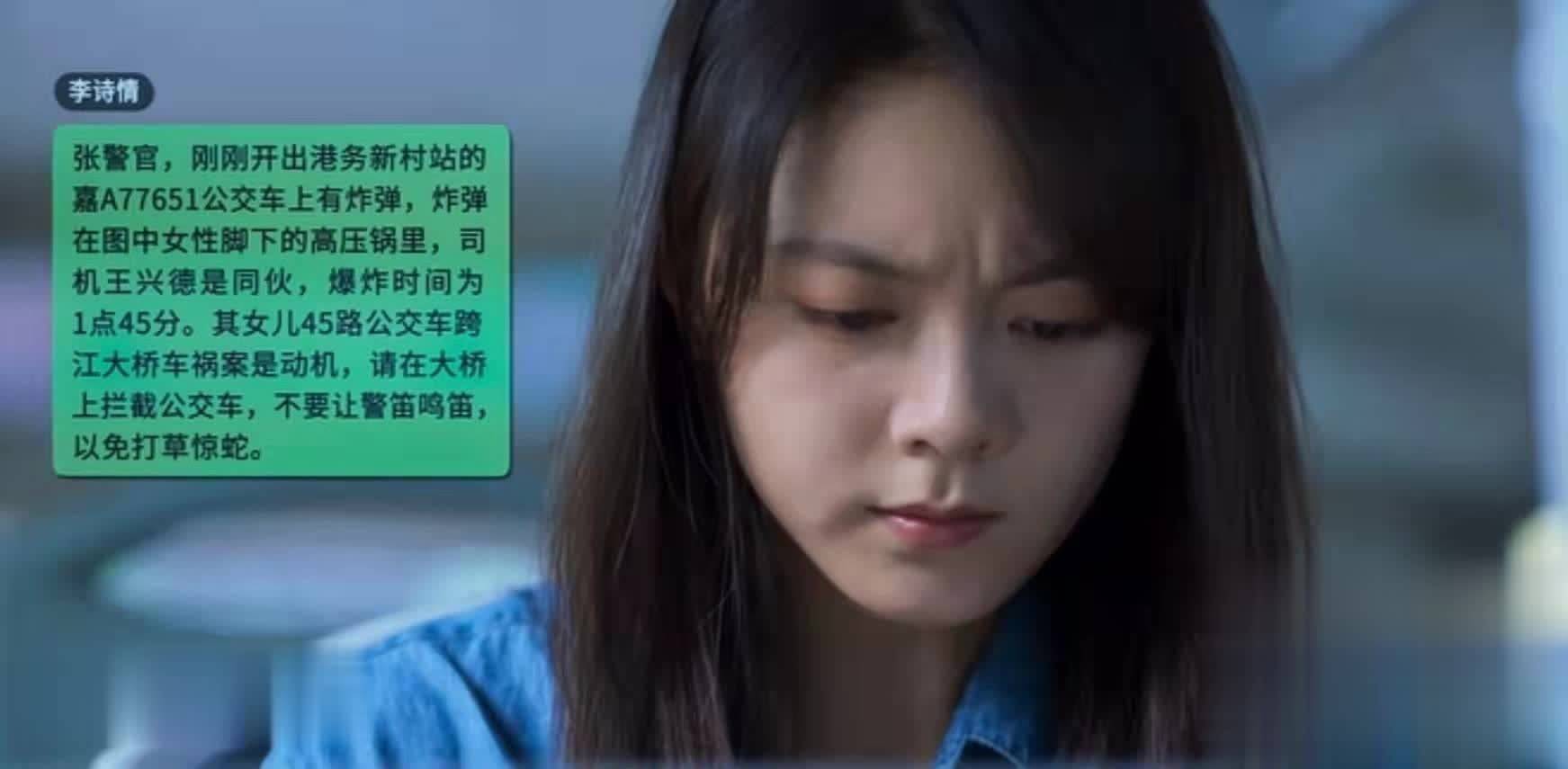 “张警官,刚刚开出港务新村站的公交车上有炸弹,炸弹在图中女星脚下的高压锅里,司机王兴德是同伙,爆炸事件为1点45分。其女儿45路公交车跨江大桥车祸案是动机,请在大桥上拦截公交车,不要让警笛鸣笛,以免打草惊蛇”。
