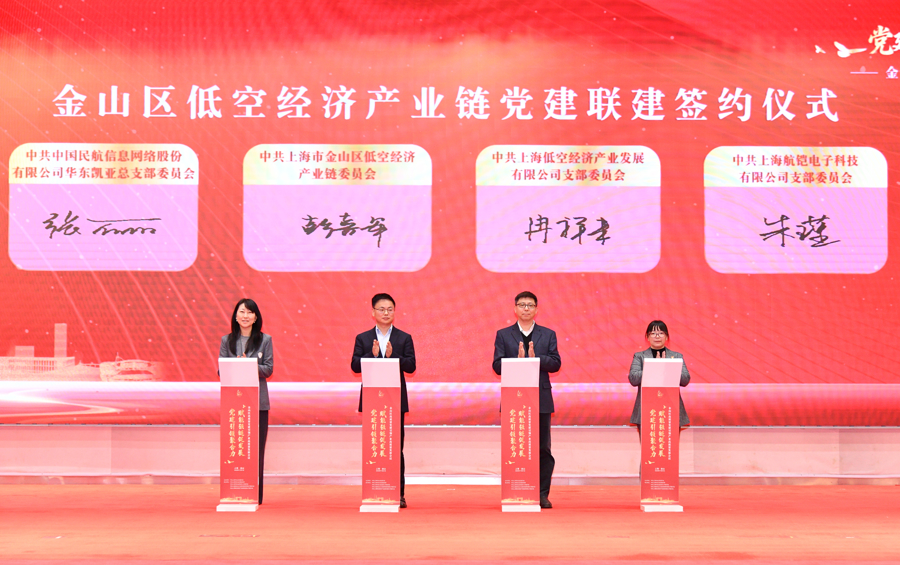 不仅如此,金山区低空经济产业链再次与上海低空经济公司党支部、民航华东凯亚公司党总支、上海航铠电子党支部等单位完成党建联建签约,通过持续扩大“朋友圈”,进一步强化跨领域、跨系统协同,助力金山打造“低空经济+数字经济”融合发展新标杆。